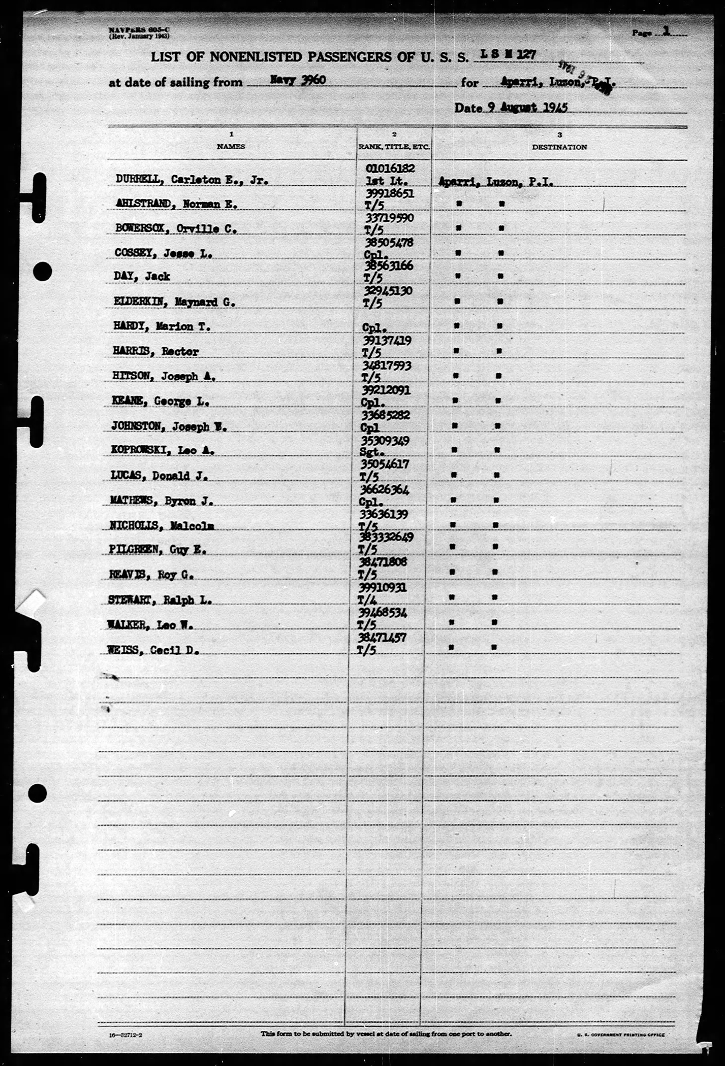 Page 1, Muster Roll dated 9 August 1945 for LSM-127 carrying personnel of Co. B, 727th Amph Trac Bn from Lingayen, Luzon to Aparri, Luzon **