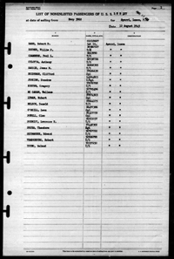 Page 1, Muster Roll dated 12 August 1945 for LSM-127 carrying personnel of Co. B, 727th Amph Trac Bn from Lingayen, Luzon to Aparri, Luzon **
