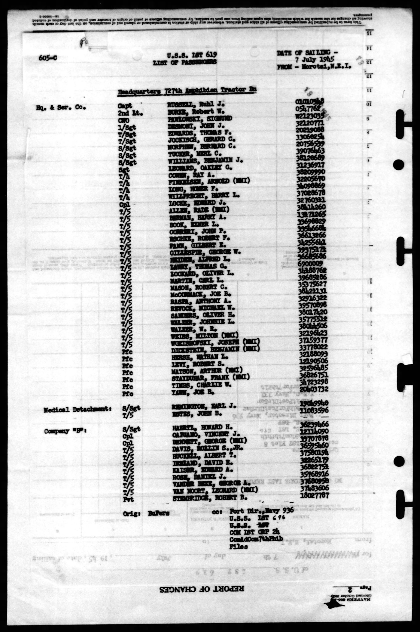 Muster Roll dated 7 July 1945 for LST-619 carrying Hqs Co., 727th Amph Trac Bn from Morotai to Aparri, Luzon **