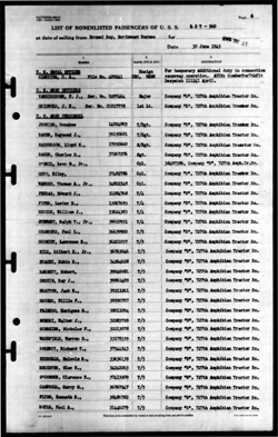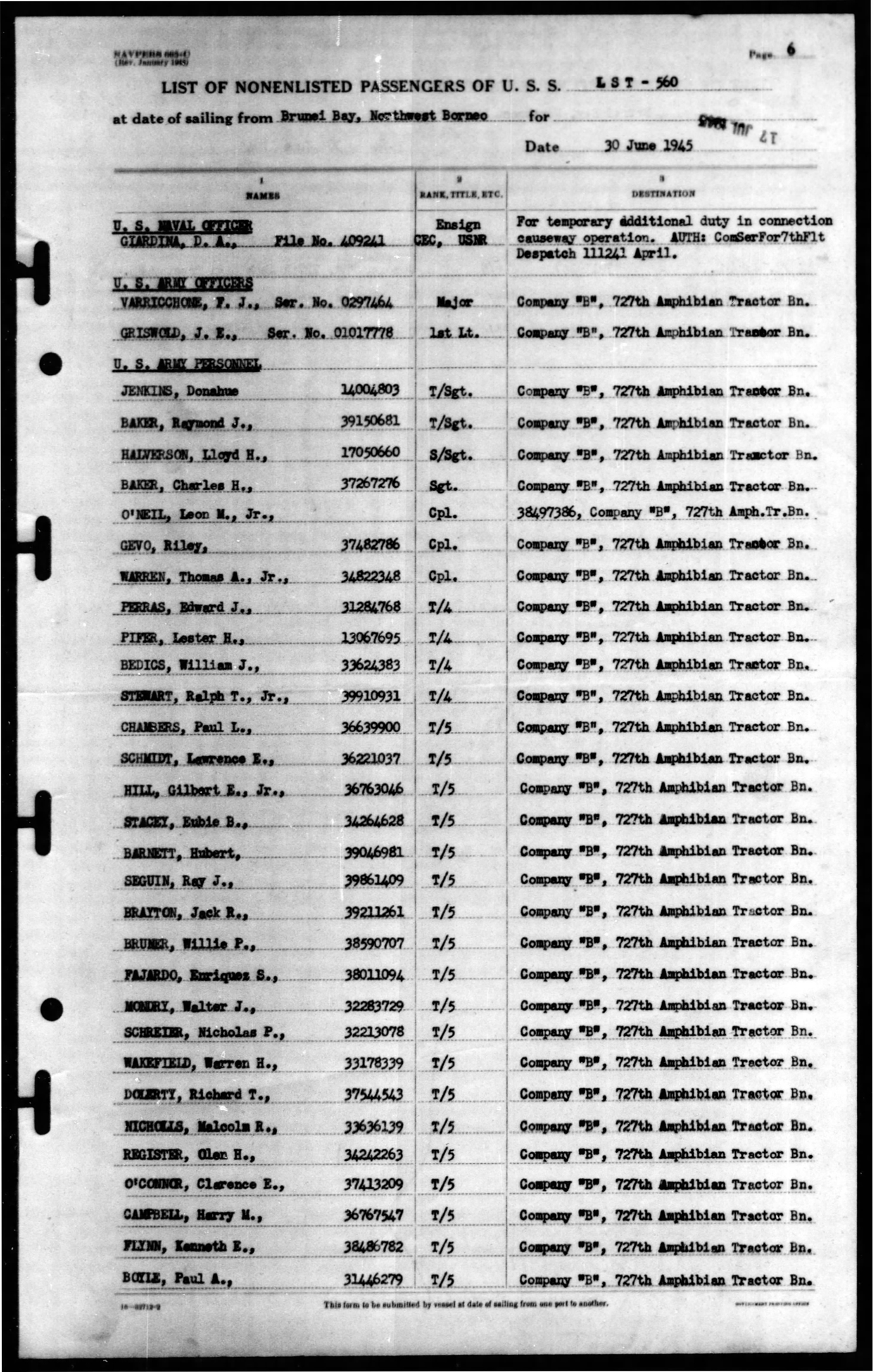 Page 6, Muster Roll dated 30 June 1945 for LST-560 carrying Co. B, 727th Amph Trac Bn from Brunei Bay, Borneo to Aparri, Luzon **
