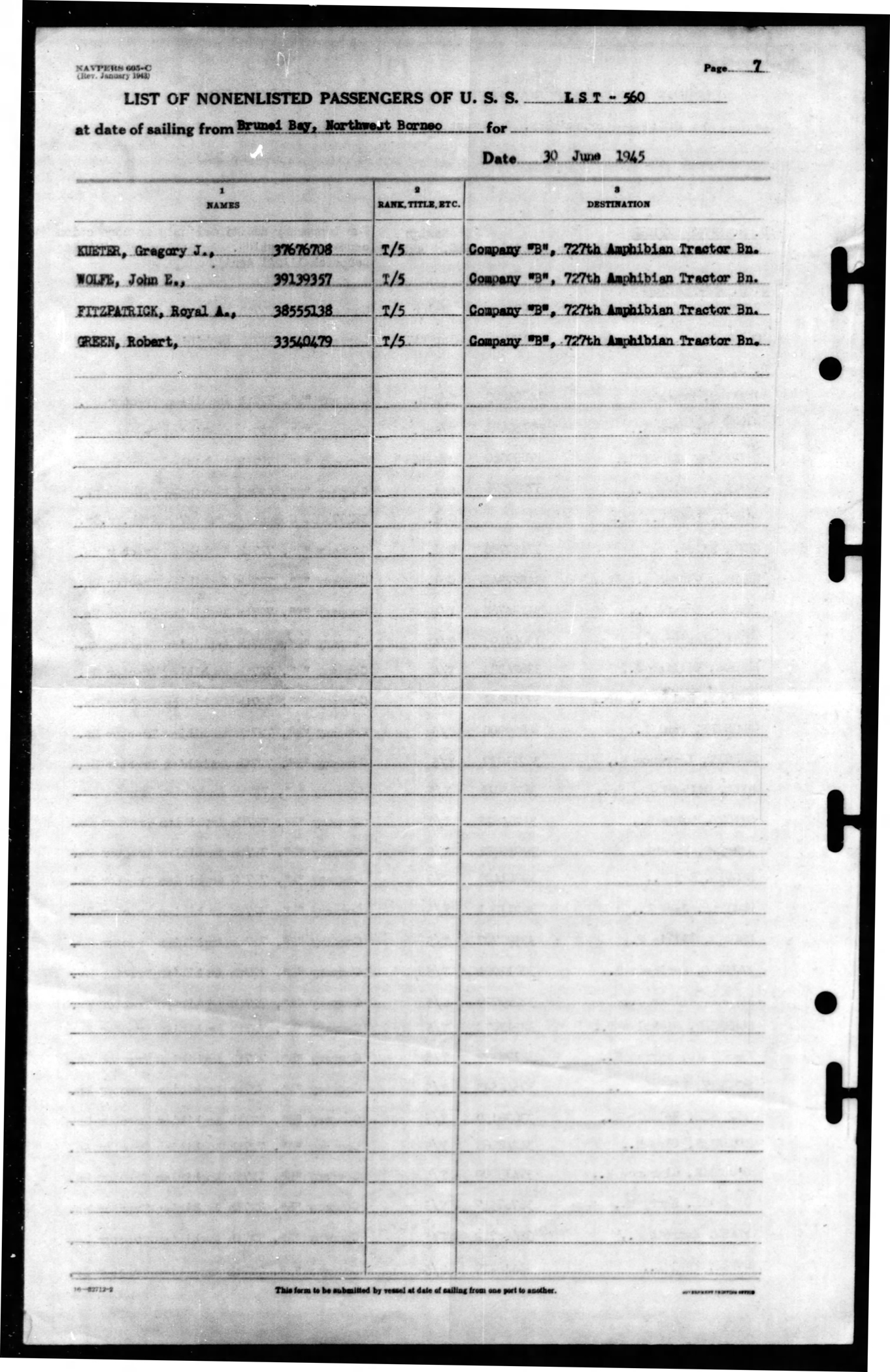 Page 7, Muster Roll dated 30 June 1945 for LST-560 carrying Co. B, 727th Amph Trac Bn from Brunei Bay, Borneo to Aparri, Luzon **