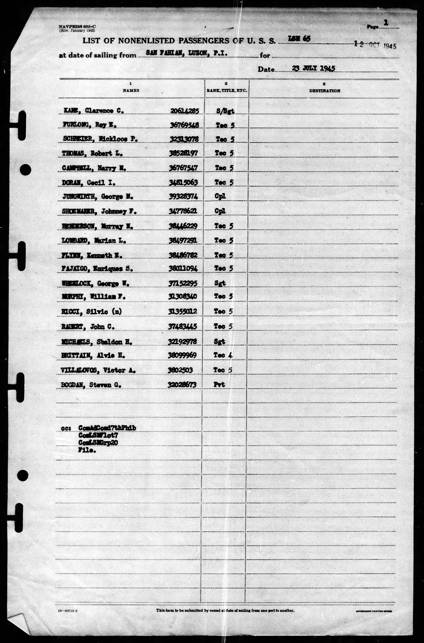 Page 1, Muster Roll dated 23 July1945 for LSM-65 carrying personnel of Co. B, 727th Amph Trac Bn from San Fabian, Luzon to Aparri, Luzon **