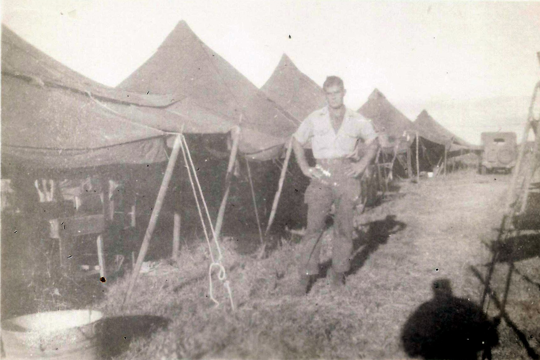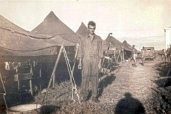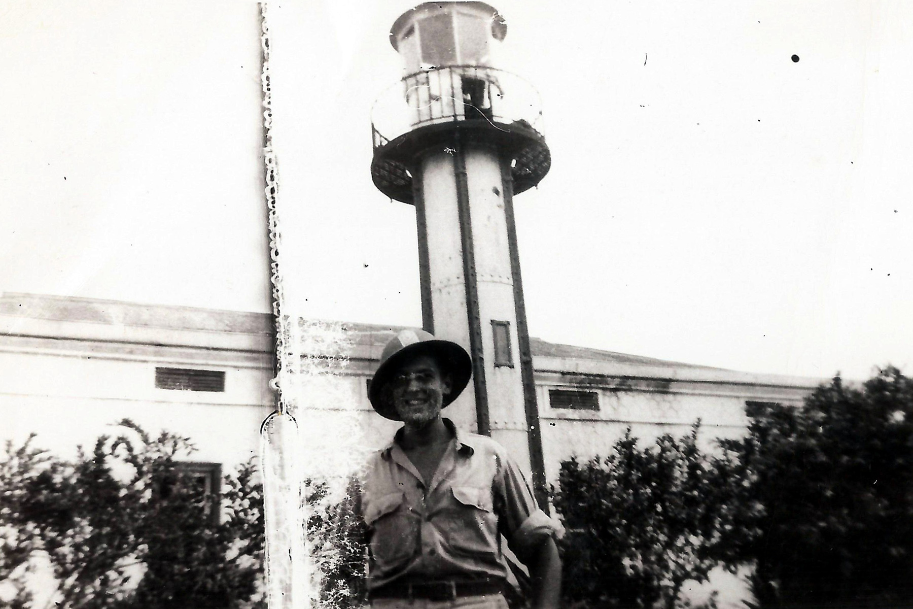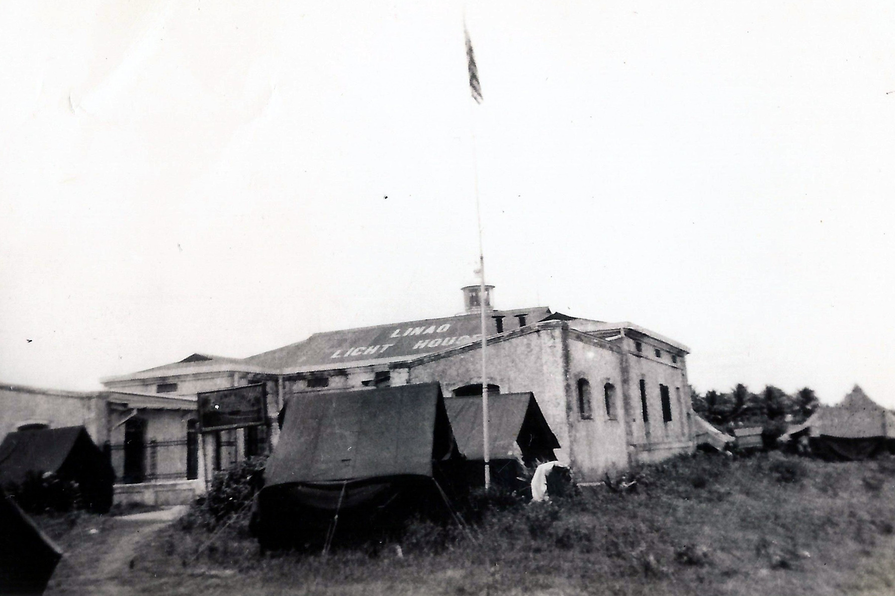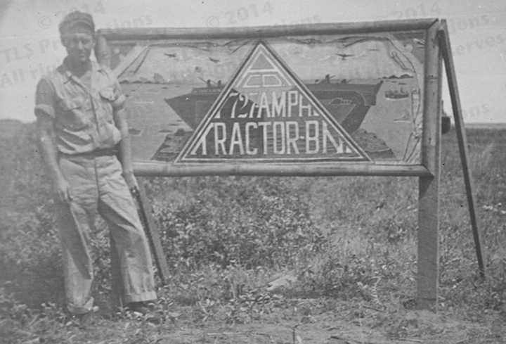 Cpl. Sorenson at Linao Point in front of sign noting base for Co. A, 727ATB